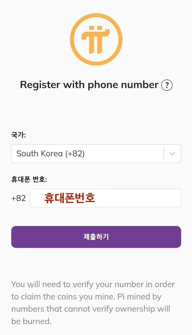 국가(south korea+82)선택 후 휴대폰번호입력허기